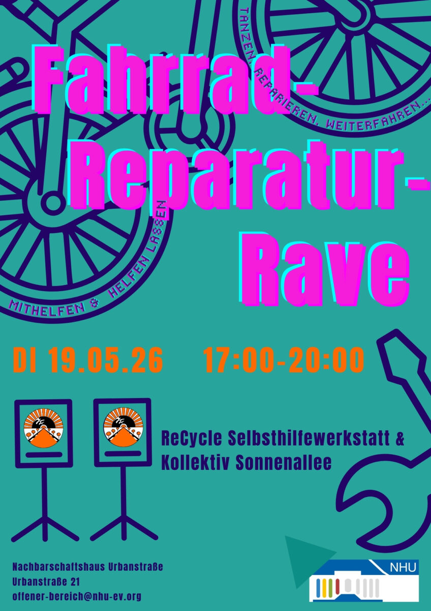 Zusammen mit dem Kollektiv Sonnenallee veranstaltet die ReCycle Selbsthilfewerkstatt einen Fahrrad-Reparatur-Rave im Nachbarschaftshaus Urbanstraße. Von 17:00-21:00 kann getanzt, repariert und geholfen werden egal, ob ihr eigene Fahrräder mitbringt oder dabei helft, andere Räder zu reparieren. Das Kollektiv Sonnenallee sorgt dabei mit der solarbetriebenen Soundanlage für elektronische Tanzmusik. Bei Regen fällt die Veranstaltung aus.