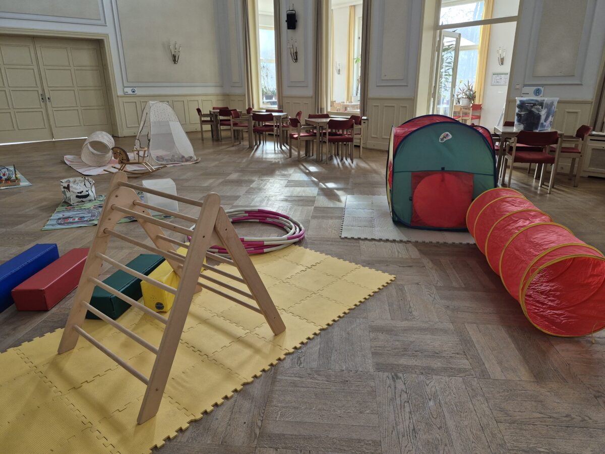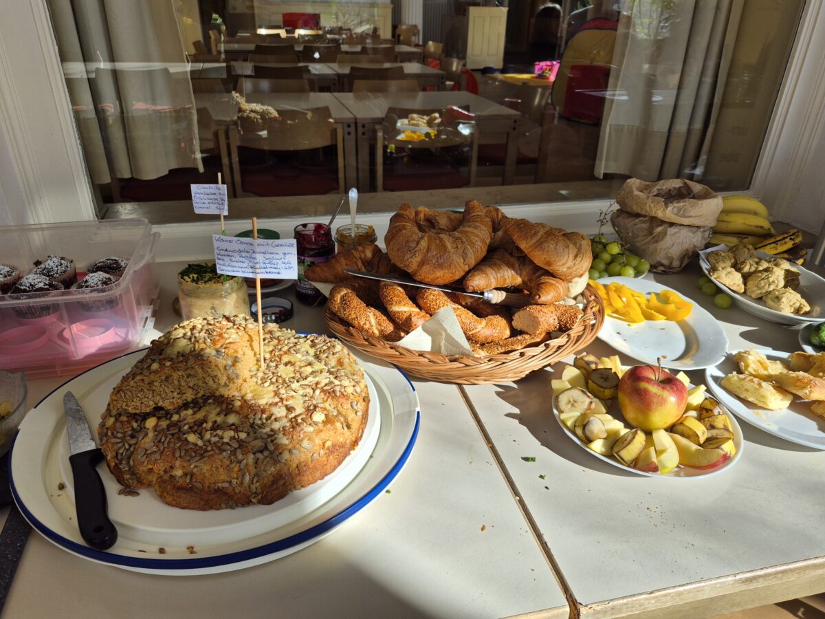 In der kalten Jahreszeit laden wir alle Familien mit (Klein-) Kinder ca. 1x im Monat zum Familienbrunch ein. Ihr könnt ohne Anmeldung vorbei kommen. Wir bitten jede Familie darum etwas für das Buffet mitzubringen. Wir stellen Obst, Müsli und einen Waffelteig. Tee und Kaffee könnt ihr günstig erwerben. Der Saal verwandelt sich in ein Spieleparadies mit einem Kleinkindbereich mit Krabbelmatte, Motorikspielzeug und Bällebad. Für die etwas größeren Kids gibt es Bauklötze, Holzeisenbahn, Lego, Duplo und Parcourselemente.