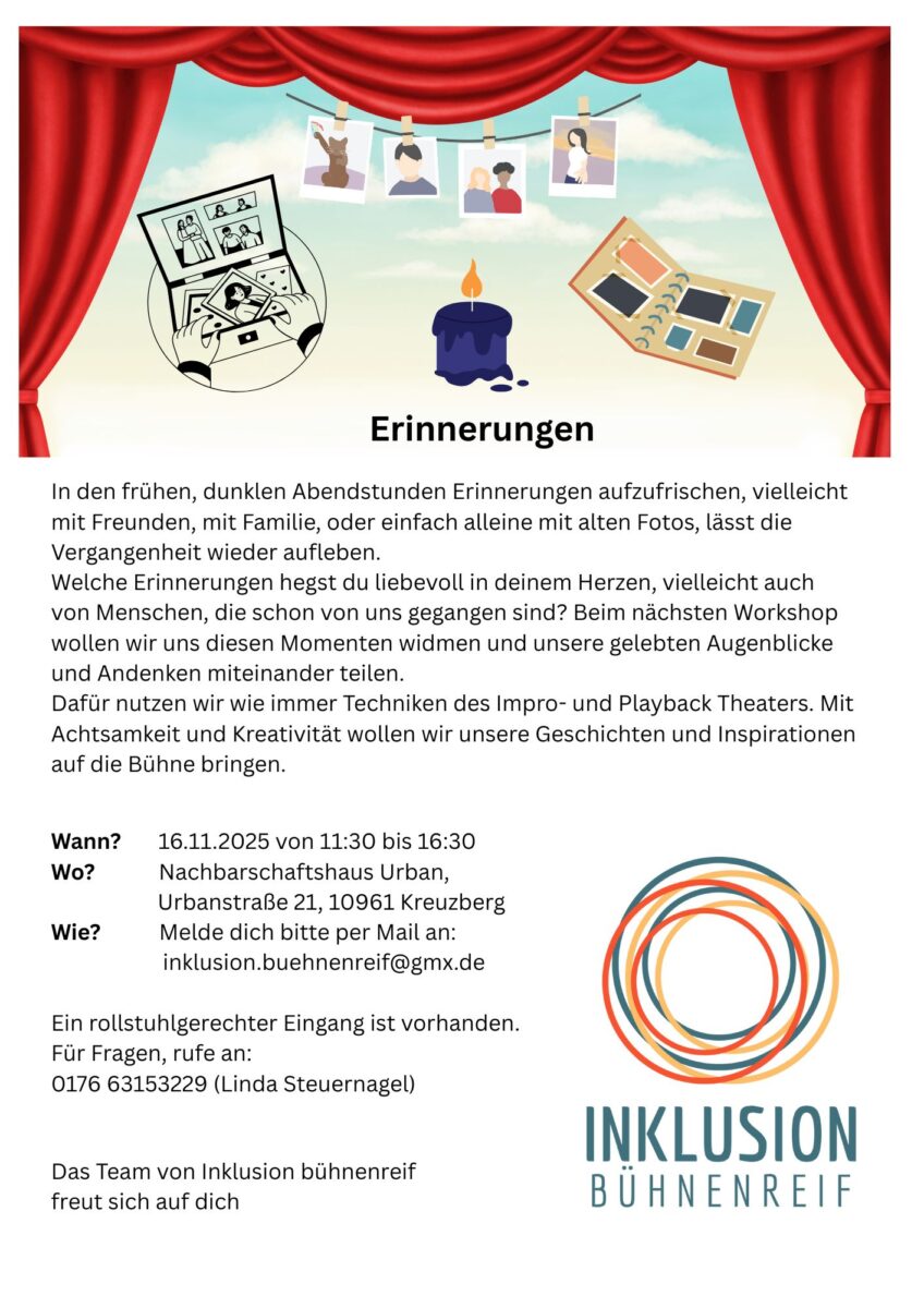 Einladung zum Workshop von Inklusion bühnenreif am 16.11.2025 mit dem Titel “Erinnerungen”