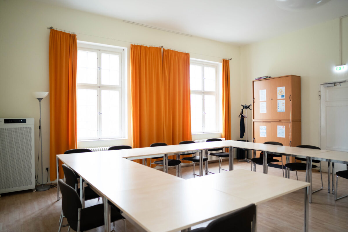 In der Nähstube finden verschiedene Näh- und Kreativangebote statt. Ein großer Holztisch schmückt die Mitte des Raumes. Dieser Raum bietet Platz für eine kleine Gruppe.